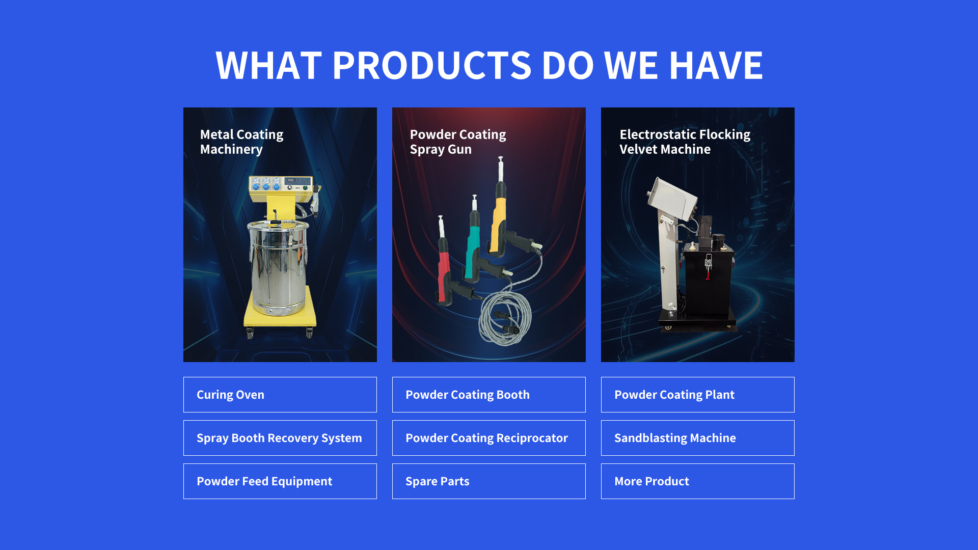 Powder Coating Guns for Sale is a handheld or automated device that applies electrostatic powder to surfaces. Key components include a nozzle, powder hopper, electrostatic generator, and trigger mechanism.